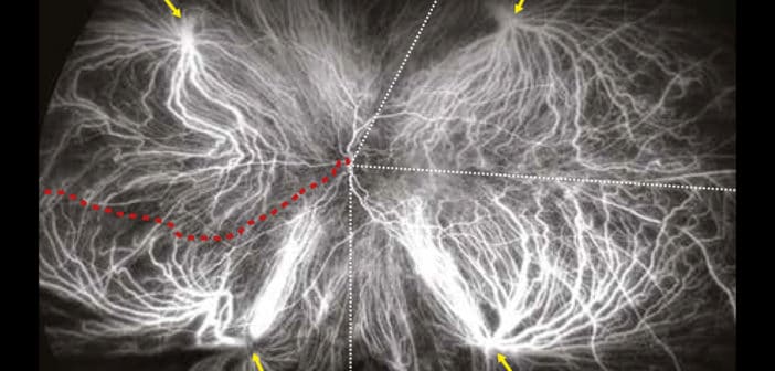 La choroïde est un tissu vasculaire dont la fonction principale est d’assurer les apports énergétiques de l’épithélium pigmentaire et la rétine externe. L’imagerie grand champ (> 100°), en particulier associée à l’injection de colorant, a permis d’affiner nos connaissances sur l’anatomie et la circulation choroïdienne. Elle permet de visualiser aisément les zones de séparation des eaux (watershed zones) et la distribution des veines vortiqueuses (parfois nombreuses) en périphérie du globe oculaire. Dans la choriorétinopathie séreuse centrale, on pourra visualiser un retard de remplissage choroïdien, des veines choroïdiennes dilatées, des anastomoses veineuses intervortex et des zones d’hyperperméabilité vasculaire choroïdienne.